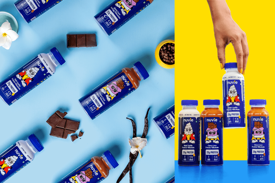 A protein shake that tastes like dessert? In a market full of brands flexing muscles and preaching discipline, we built NUVIE as the anti-protein-brand protein brand. From the winking sun logo to cartoon flavor mascots with actual personalities, every element rebels against fitness intimidation. "Nutrition for Life" means fitting into your life, not forcing you into theirs.